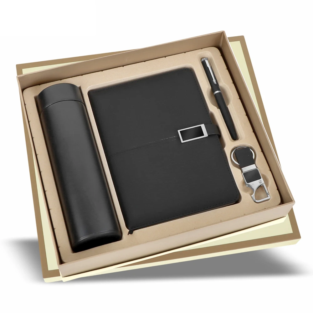 Everything a professional needs — neatly coordinated and ready to brand. This 4-in-1 set brings together a snap-clasp textured hardcover diary, a steel vacuum flask, a slim metal ballpoint pen, and a carabiner-style leather keychain, all laid out in a cream and tan two-piece rigid gift box with kraft paper inner tray.