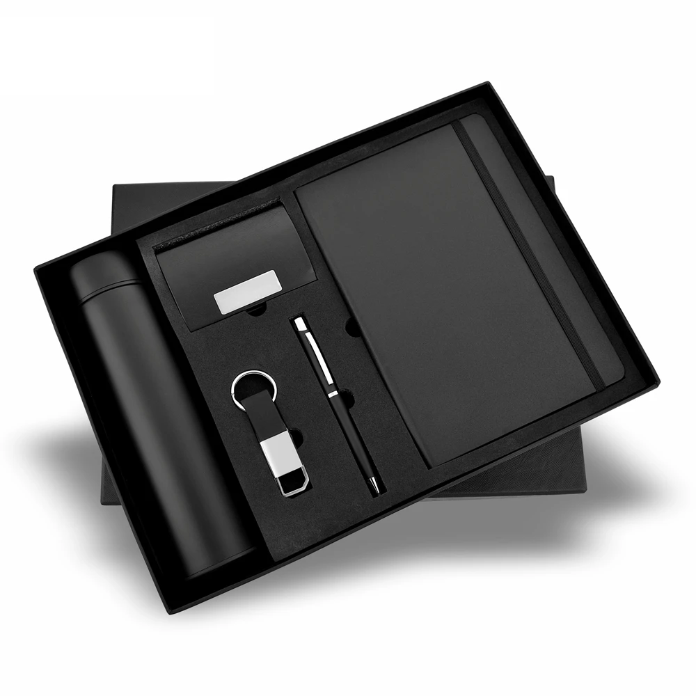 From the boardroom to the daily commute, this set covers every base. This 5-in-1 corporate gift set brings together a hardcover notebook, a steel vacuum flask, a metal card holder, a metal ballpoint pen, and a leather-strap keychain — all secured in a black rigid gift box with foam insert.