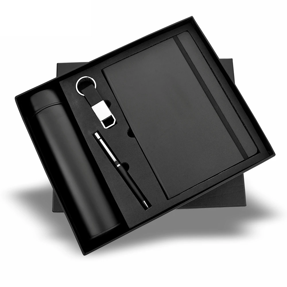 Everything your recipient reaches for daily — in a single, well-presented corporate gift set. This 4-in-1 set combines a notebook, a stainless steel temperature bottle, a metal ballpoint pen, and a leather-strap keychain, all seated neatly in a structured black rigid box with foam insert. Available in All-White and All-Black, both colourways deliver a sharp, consistent brand presentation that works equally well for employee onboarding, client gifting, and large-scale corporate events. Every item in the set offers a dedicated surface for logo printing, laser engraving, or UV Printing.