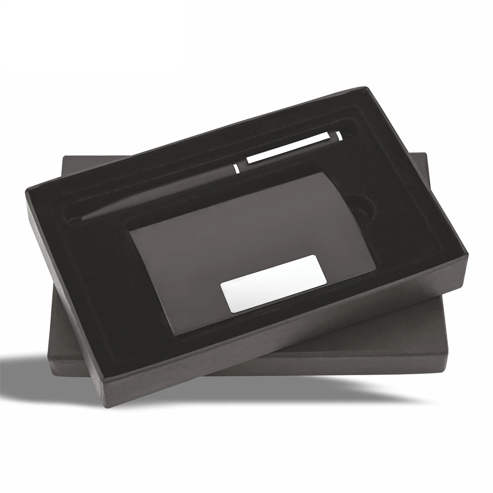 - Custom Logo Branding — Logo printing or laser engraving on card holder branding plate and pen body