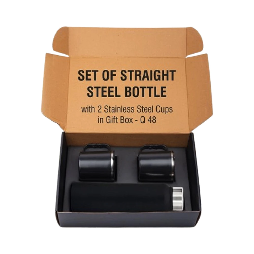 - Complete 3-Piece Set — Each variant includes one bottle and two matching matte black steel mugs