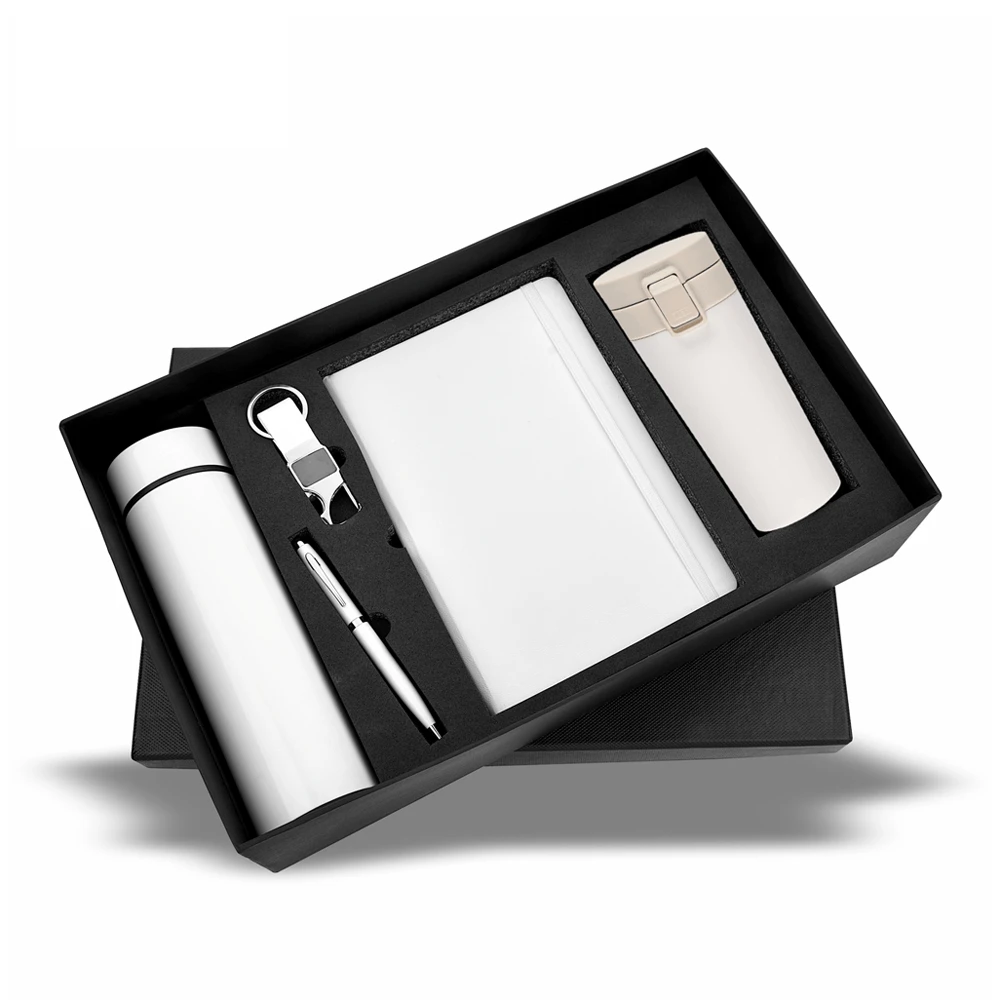 When every item in the set earns its place, your brand stays in sight all day long. This 5-in-1 corporate gift set combines a hardcover notebook, a steel vacuum flask, a travel tumbler with push-button flip lid, a metal ballpoint pen, and a leather-strap keychain — all presented in a black rigid gift box with foam insert.
