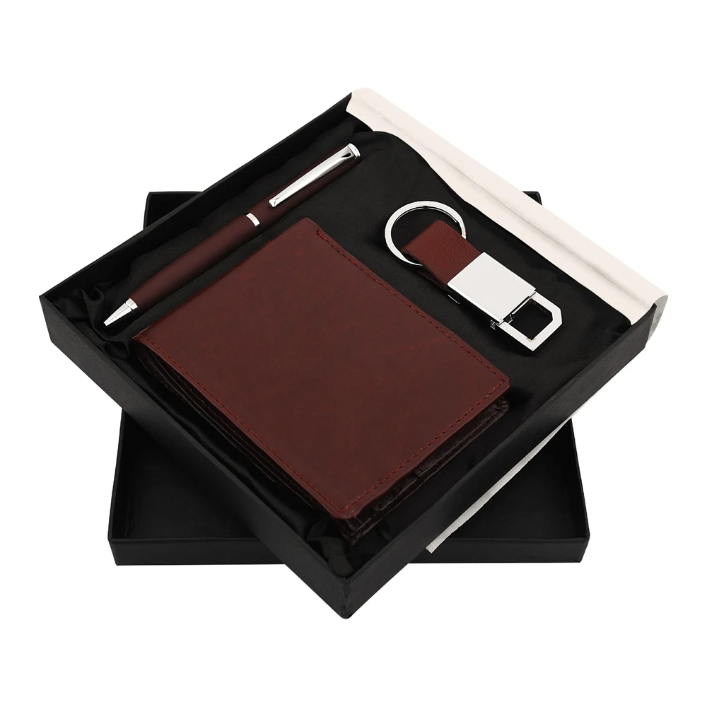 A wallet is the one thing your recipient never leaves home without — making this the corporate gift with the highest daily brand visibility of all. The Pen, Wallet & Keychain Gift Set from Kee Creation brings together a sleek metal ballpen, a premium stitched leather bifold wallet, and a silver rectangular keychain with a branding plate, all presented in a velvet-lined black gift box. Three everyday essentials, one unforgettable brand impression.