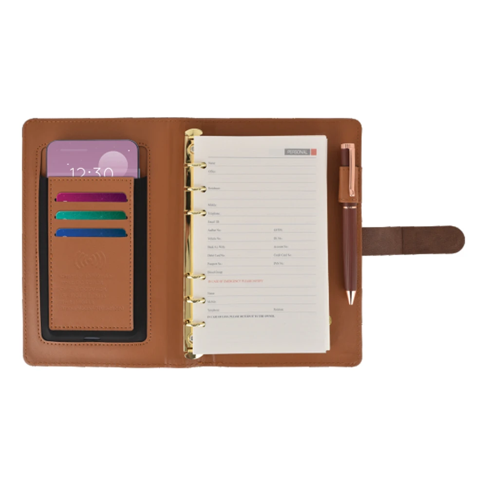 - Gold Ring-Bound Refillable Notepad: Removable and refillable A6 notepad with gold ring binding — paired with card slots and a phone pocket for complete daily organisation.