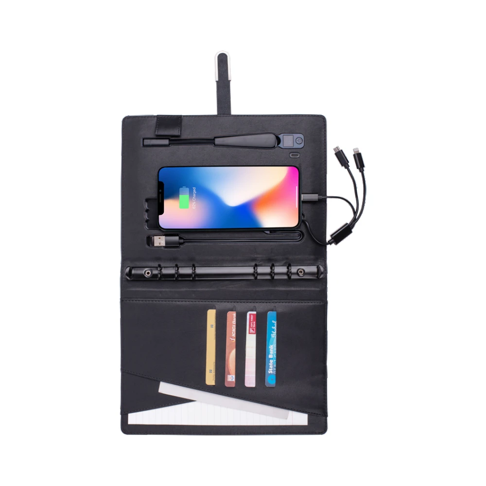 This smart folio takes corporate branding a step further with a built-in LED branding plate that illuminates your logo on the cover — a first-impression detail that no standard notebook can match. The built-in 8000mAh power bank with wireless charging pad keeps compatible devices charged throughout the day, while a foldable reading lamp and stored multi-connector charging cable add genuine daily utility. Inside, a ring-bound notepad sits alongside multiple card slots for a fully functional organisational setup.