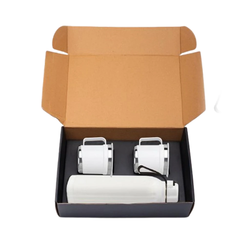 White is the colour of clarity — and this set delivers exactly that. The White Steel Bottle & Mugs Set from Kee Creation features a premium white stainless steel bottle with a practical black loop cap, paired with two matching white steel mugs with polished silver rims, all presented in a custom black foam-lined kraft gift box. A fresh, modern gifting choice that stands out from the sea of standard black drinkware sets.
